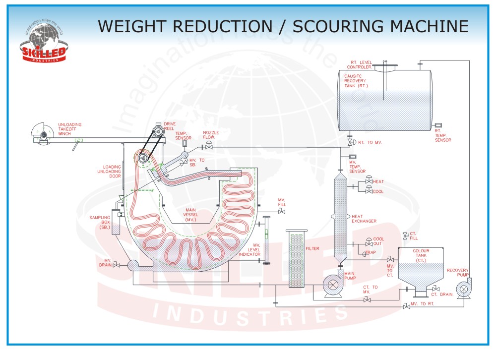 - Process of 30 to 350 gms./sq. meter of fabric no variation, because of both alkali solution and the fabric are being circulated forcefully, no hanger pin trace, no selvage stretching and overlapping.